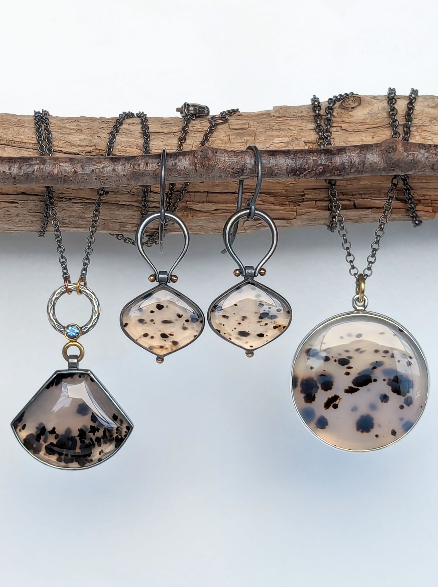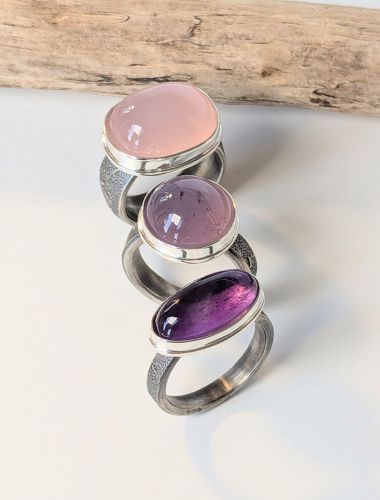 We take great pride in the process of hand crafting bold, beautiful one-of-a-kind jewellery, from raw semi-precious stone, to polished piece. In most of our pieces we have chosen designs that are contemporary with clean lines to allow the gemstones to have center stage. We often refer to color schemes found in nature or color theory to inspire us to make striking gemstone combinations in our work.