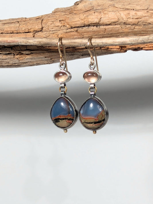Blue Oregon Opal and Schiller Oregon Sunstone Earrings, Sterling Silver 18K Gold