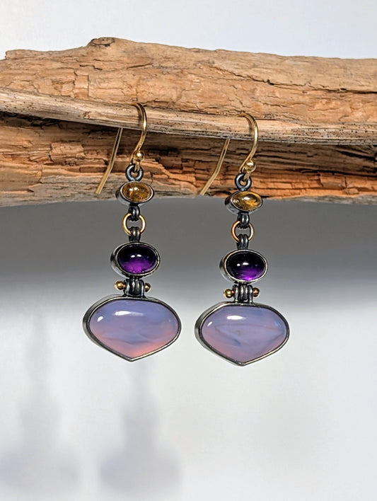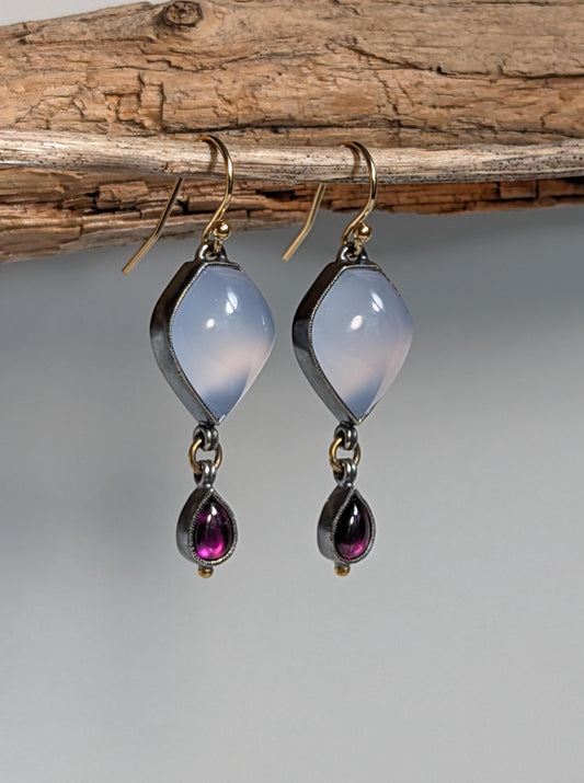 Abyssinian Blue Chalcedony Earrings, Purple Rhodolite Garnet Earrings, Sterling Silver, 18K Gold