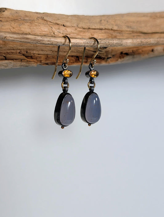 Turkish Blue Chalcedony and Mexican Fire Opal Earrings, Sterling Silver, 18K Gold