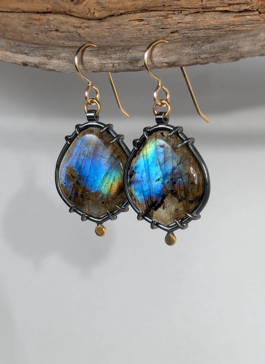 Labradorite Earrings, Sterling Silver, 18K Gold