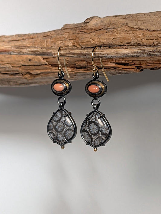 Fossilized Coral Earrings, Vintage Coral Earrings, Sterling Silver, 18K Gold
