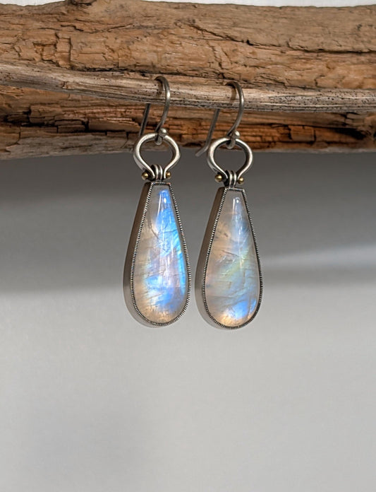 Rainbow Moonstone Earrings, Sterling Silver, 18K Gold