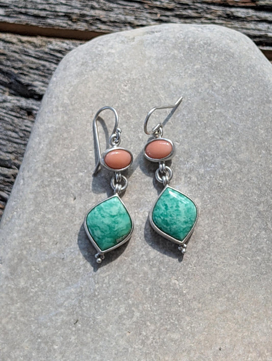 Lucin Variscite Earrings, Vintage Angelskin Coral Earrings, Sterling Silver