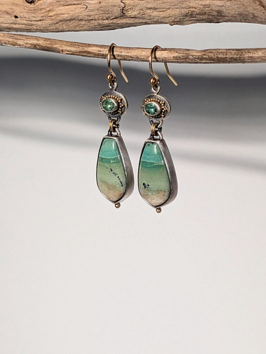Ray Mine Sagenite Silicated Chrysocolla and Apatite Earrings, Sterling Silver, 18K Gold Accents