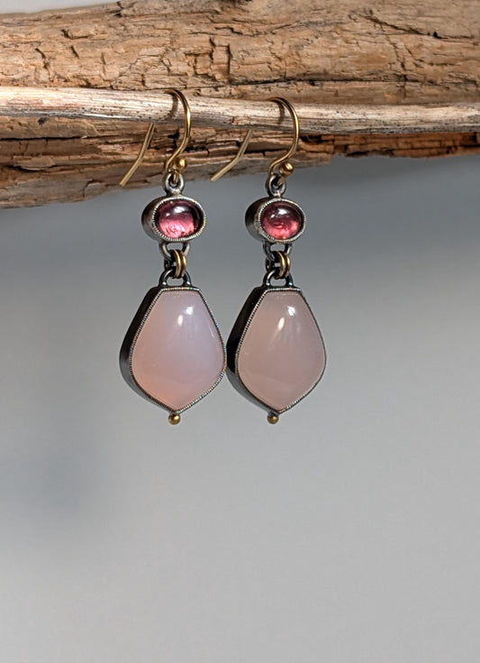 Pink Chalcedony and Pink Tourmaline Earrings, Sterling Silver, 18K Gold