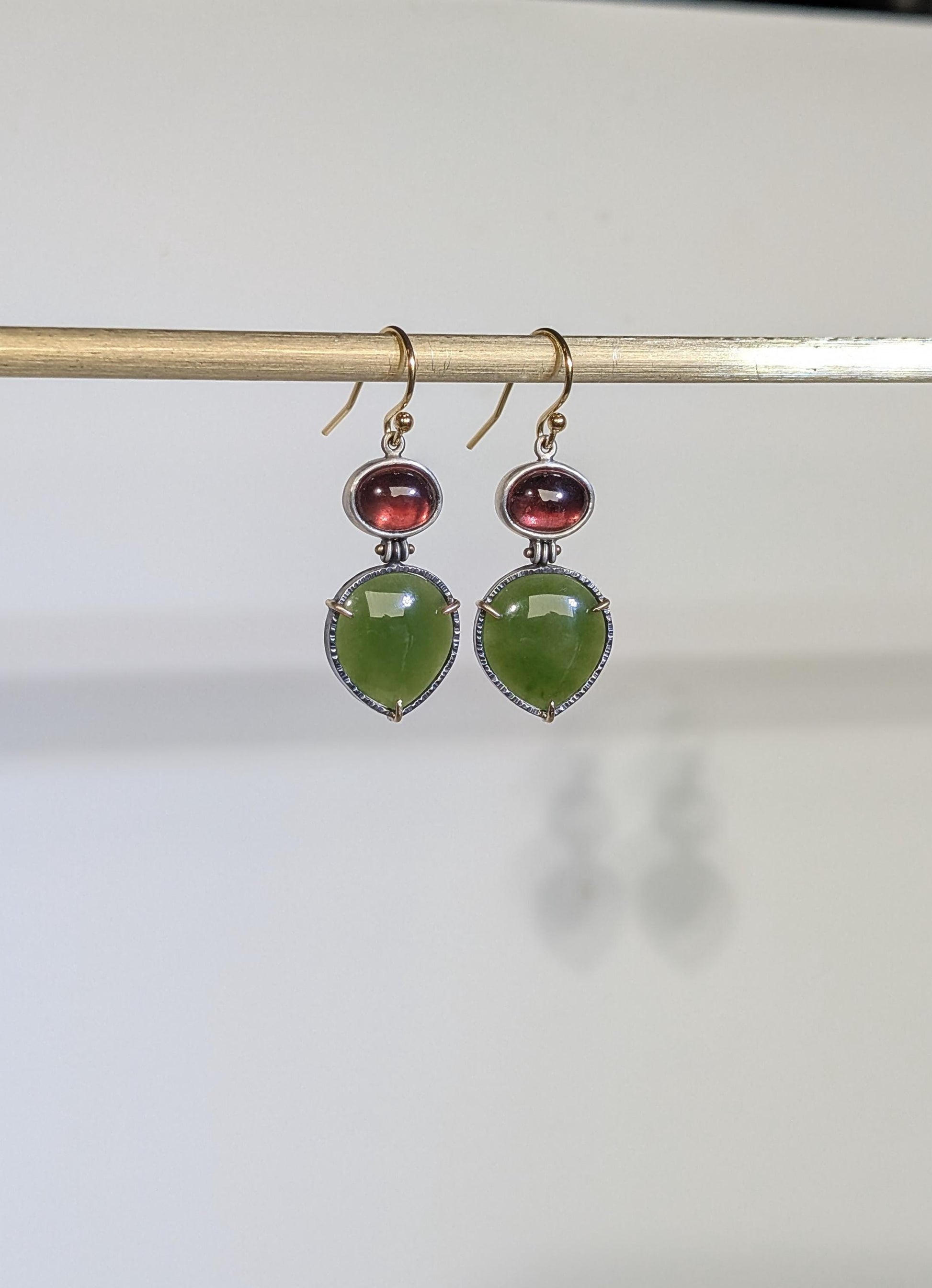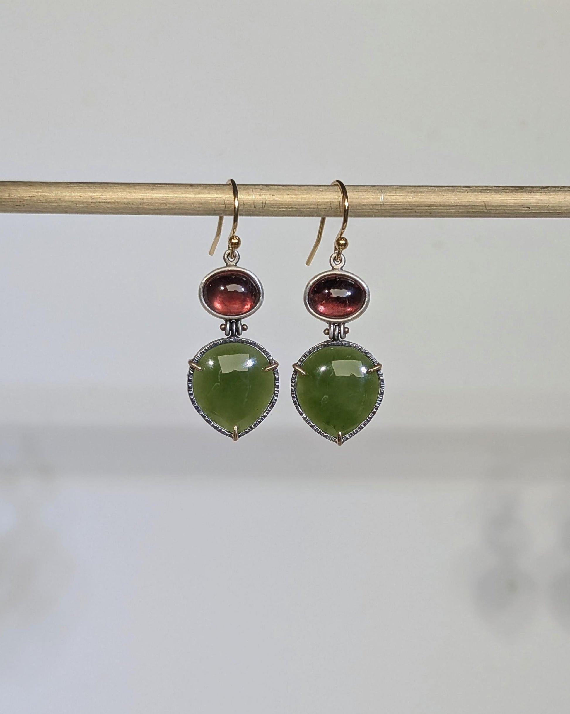 BC Jade Earrings, Tanga Garnet Earrings, Sterling Silver 14K Gold