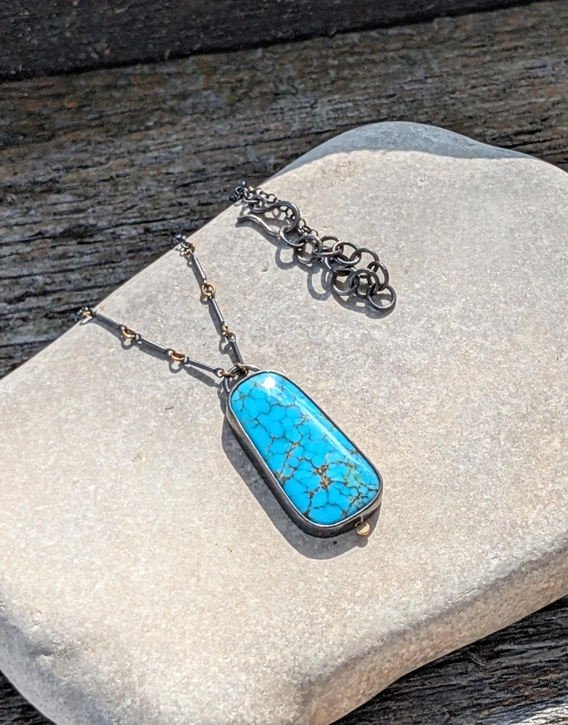 The setting is made of oxidized sterling/fine silver with 18K gold accents found on the 8 jump ring stations on the chain as well as the disc at the bottom of the turquoise setting. The chain is oxidized sterling silver and is adjustable with a hook and extension rings from 17-19".