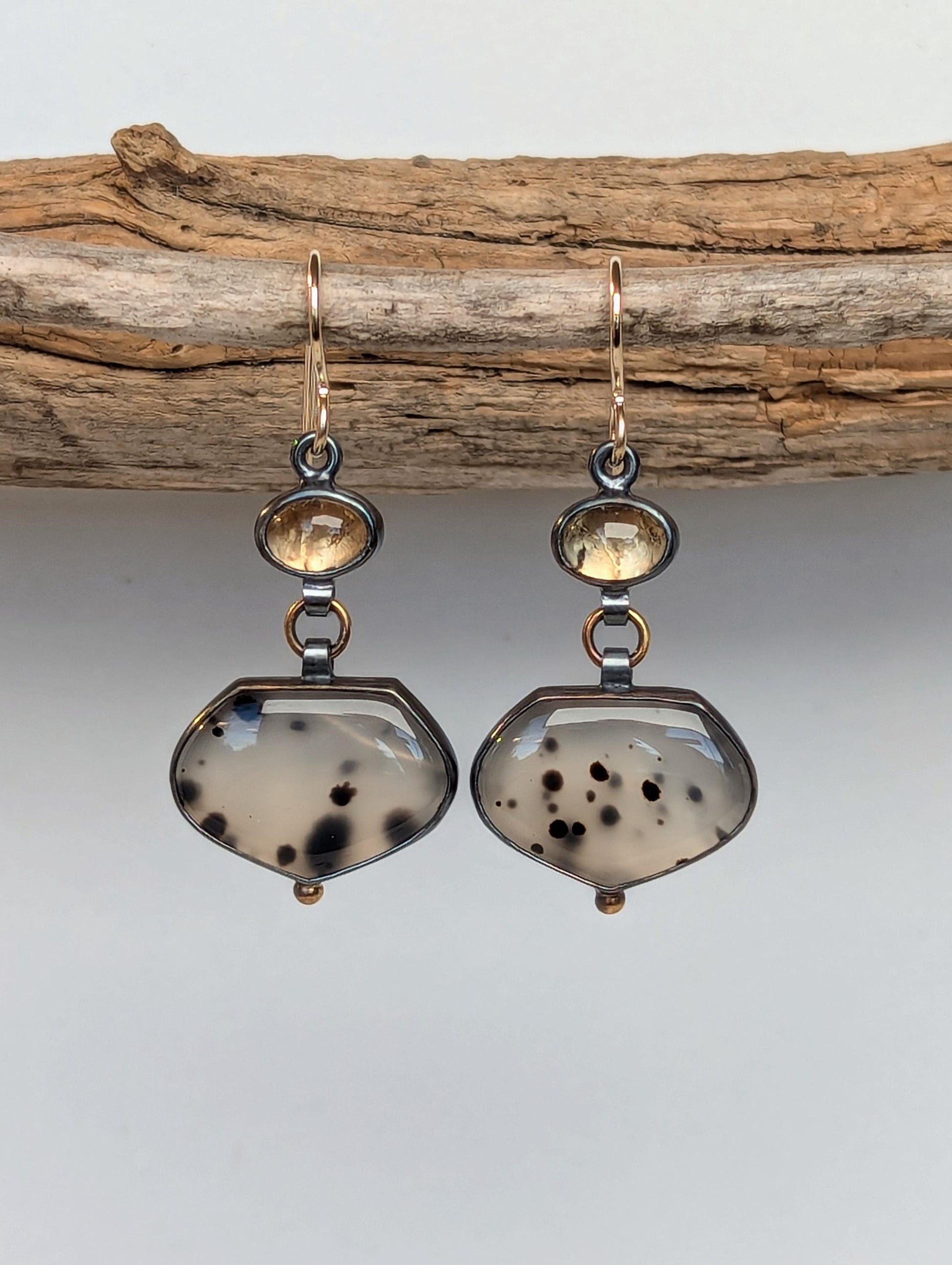 The settings are made of oxidized sterling/fine silver with 18k gold accents found in the connecting rings as well as the decorative balls on the bottom of the agate setting. The earwires are made of 14k gold fill.