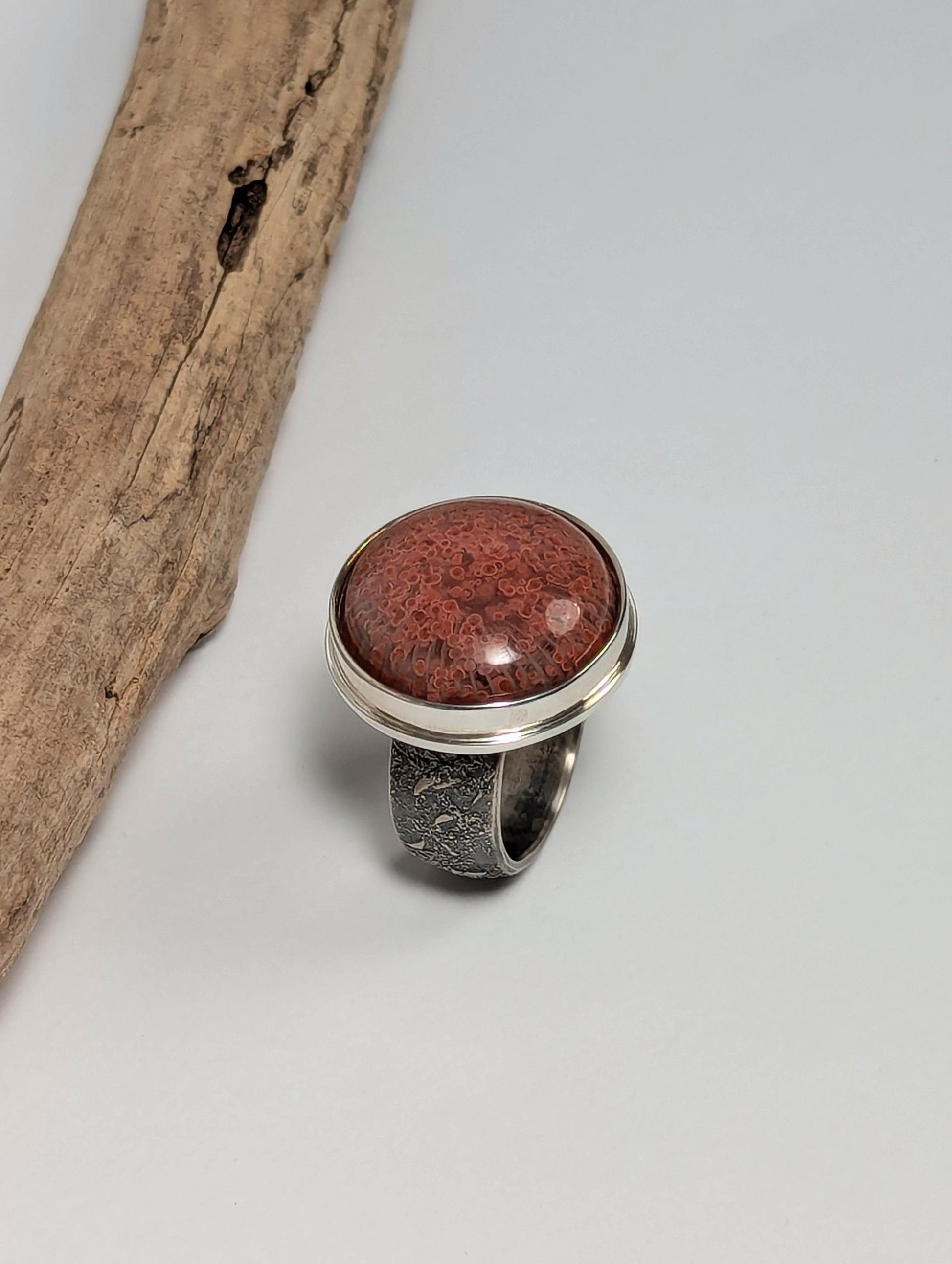 Utah Red Horn Fossil Coral Ring, Sterling Silver